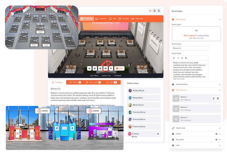 vFairs virtual exhibit hall features adapt to any event goal. From attendee engagement to giving exhibitors more value, deliver versatile experiences for every event whether trade shows, hiring events, or more.