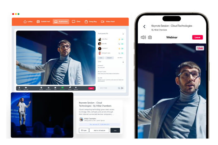 Choose vFairs to create a consistent experience for onsite and online conference attendees. Register attendees, offer onsite check-ins, and create a custom mobile app and virtual event through a single platform.