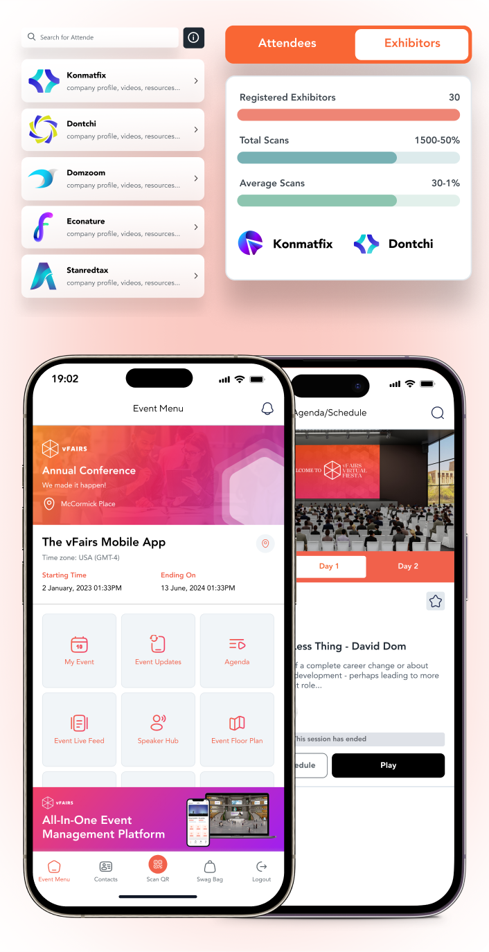 The vFairs event app offers a platform where attendees can make connections, engage with event content, and find information.