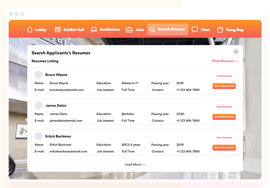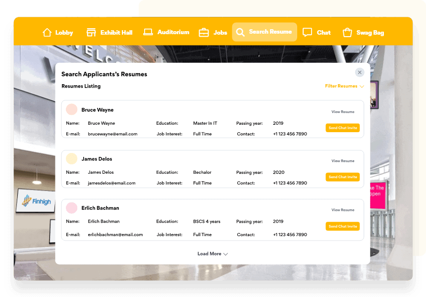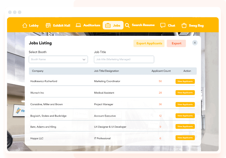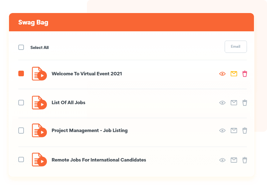 Let employers post job openings and job descriptions on their booths. Help your alumni browse through information at their own pace and save it for later use with our virtual swag bag.