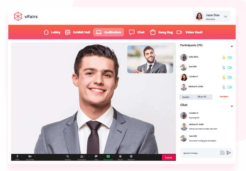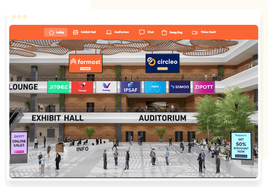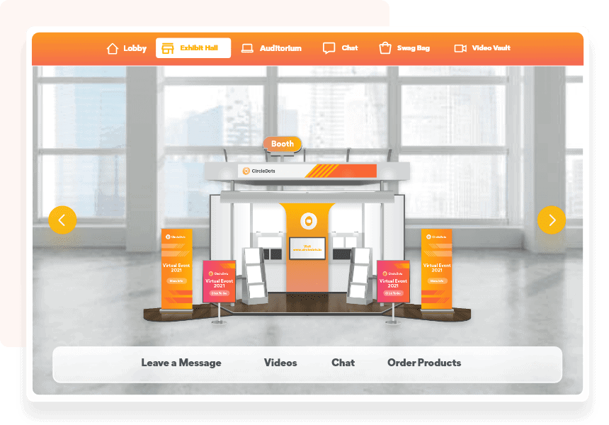 Use our 1:1 or group chatrooms that support video, audio, and text to connect with attendees. Talk to leads, make a sales pitch, and generate long-lasting interest. Use our shopping cart feature to collect deposits right at the event.