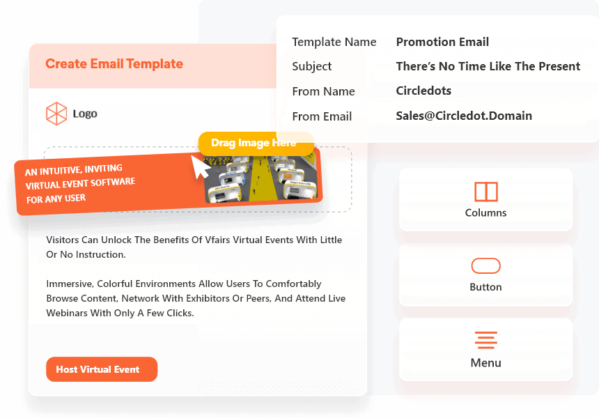 Easily schedule personalized emails for before, during, and after the event. Our easy-to-use drag & drop builder lets you customize every email to your liking, and send automated emails to lists of predetermined contact lists.