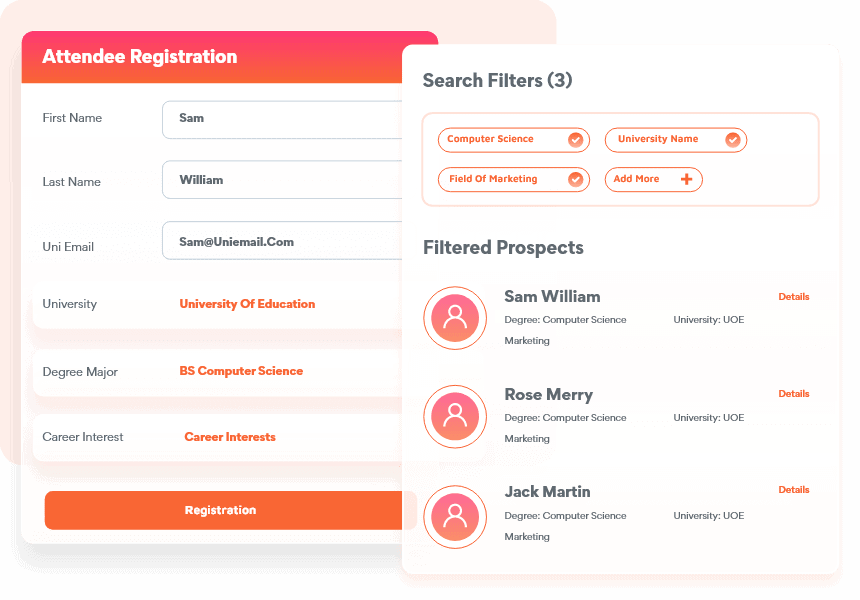Capture information that matters the most to your organization by including custom fields in your event registration form. Then filter out prospects and find the best talent using the built in resume search.