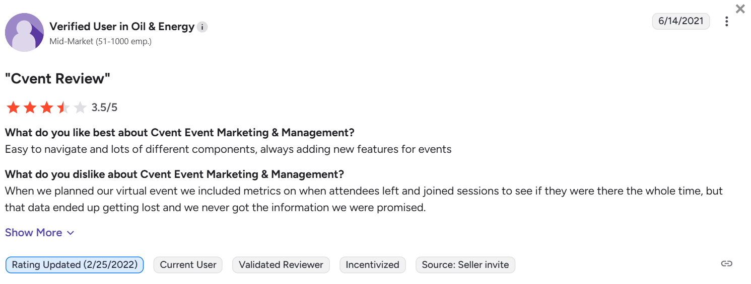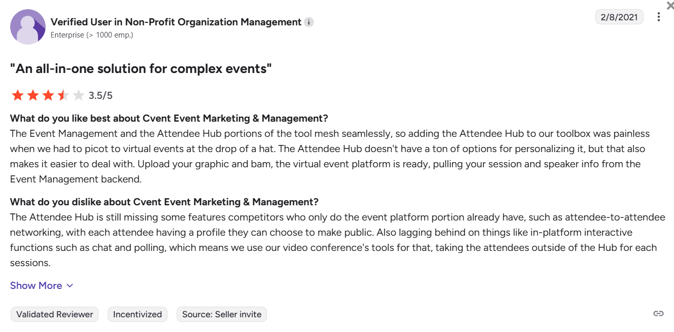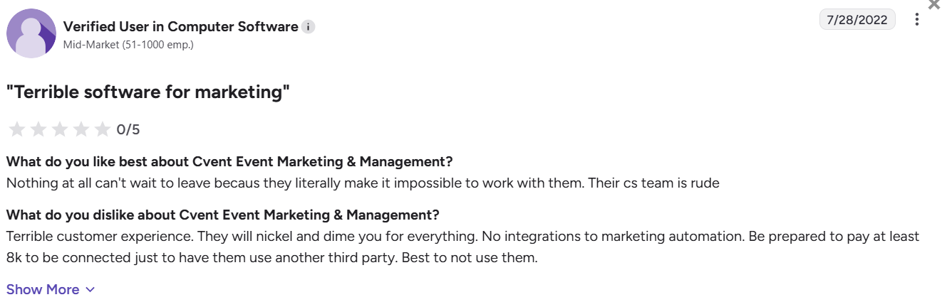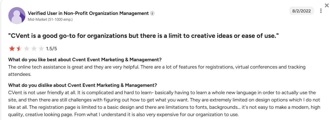 “The lack of ease of integrating Cvent with other systems. I would love to have Cvent work with all of the systems we use for our event, however, integrations with Cvent are VERY difficult.” – Verified User in Computer Software