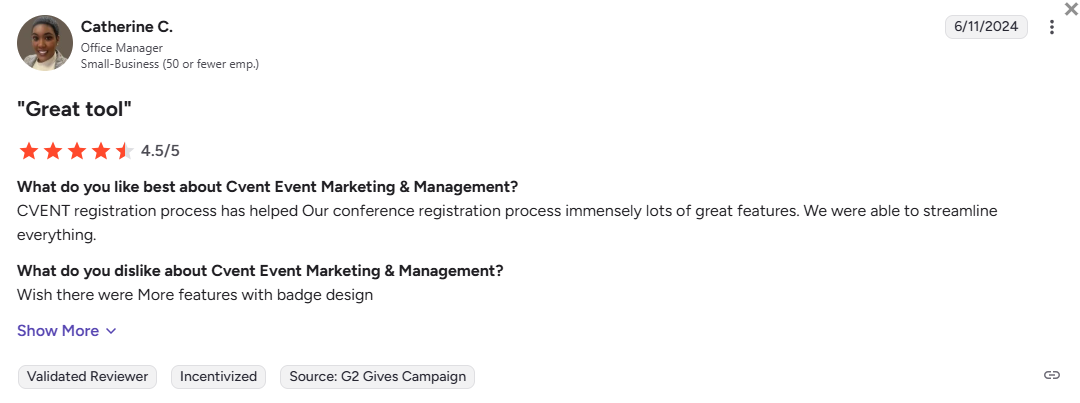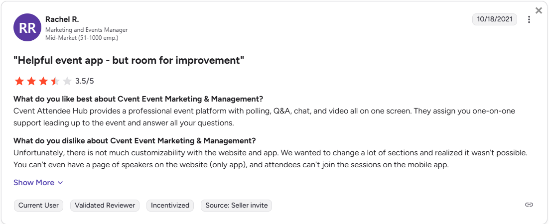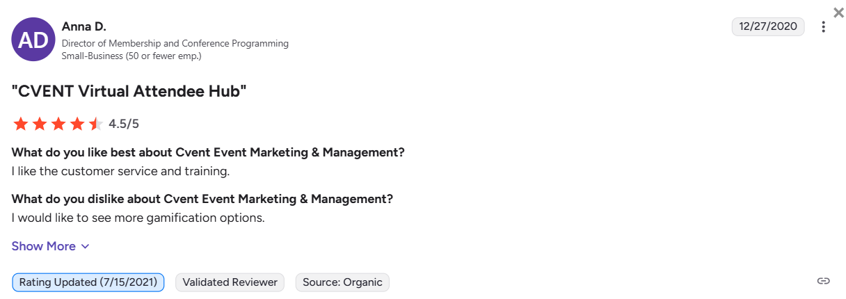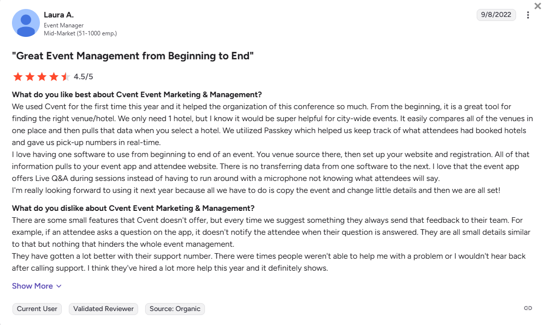 “There are some small features that Cvent doesn’t offer, but every time we suggest something they always send that feedback to their team. For example, if an attendee asks a question on the app, it doesn’t notify the attendee when their question is answered. They are all small details similar to that but nothing that hinders the whole event management.” – Laura A.