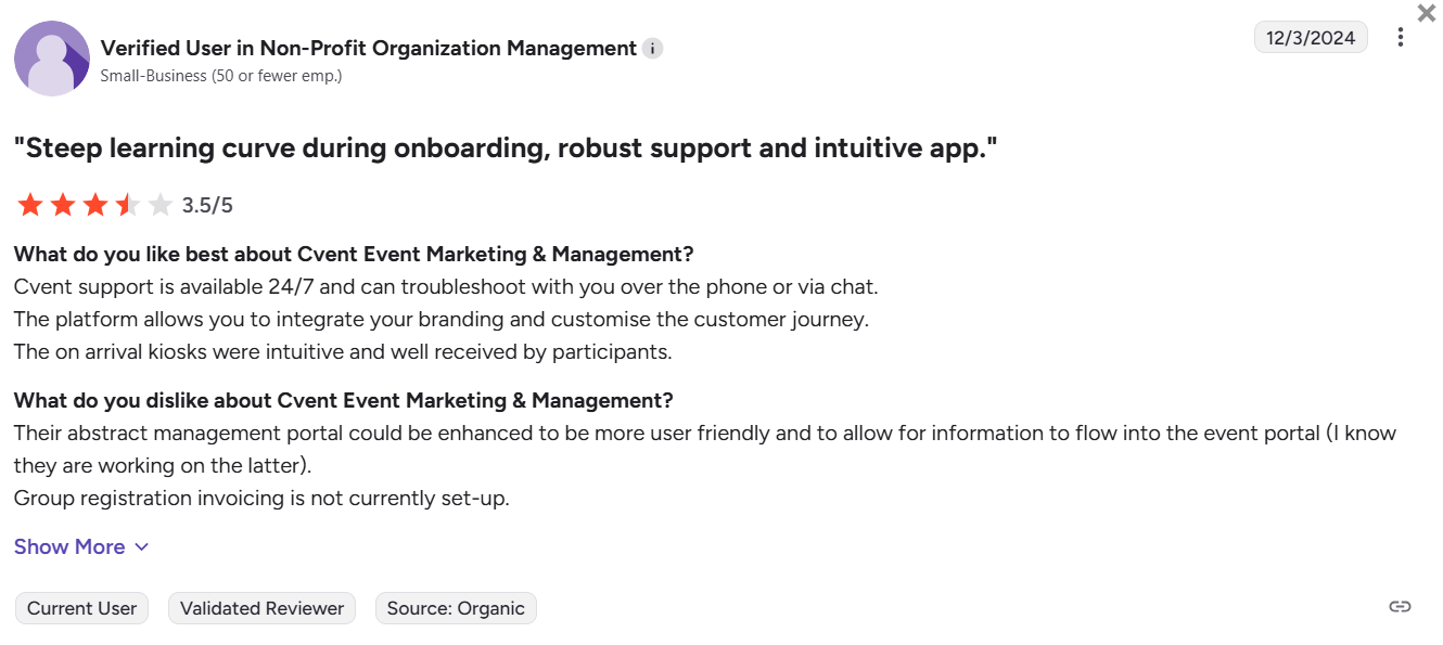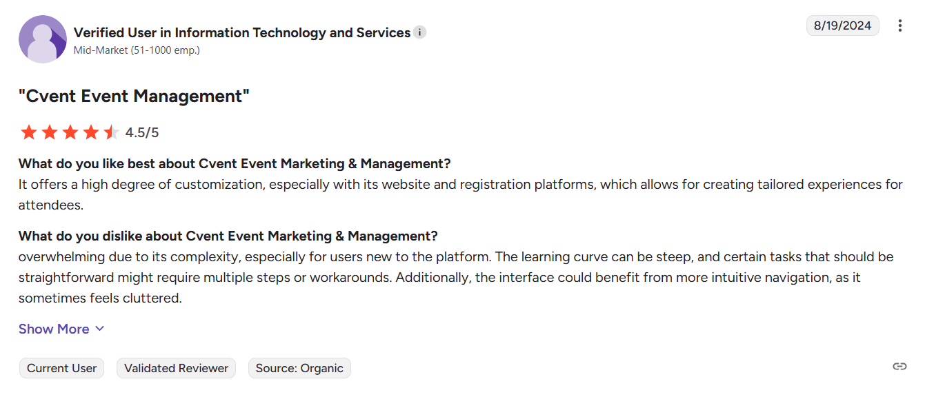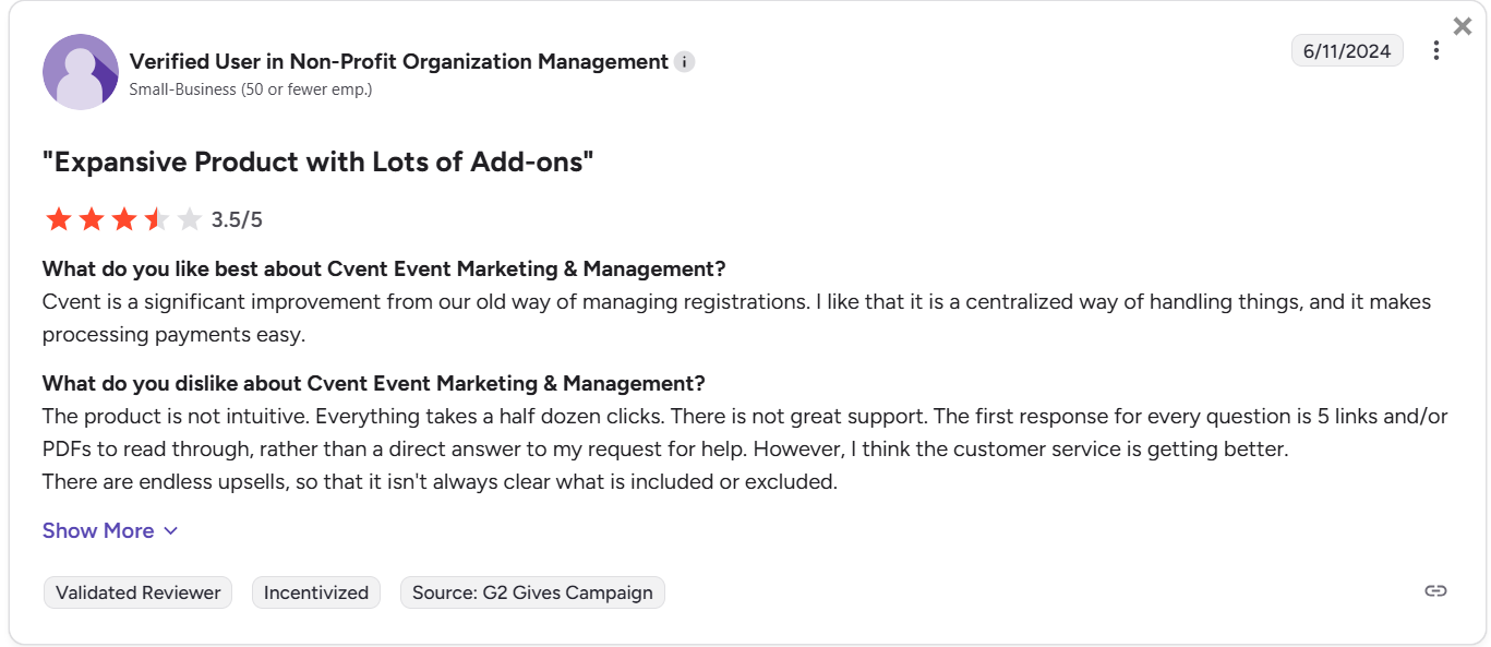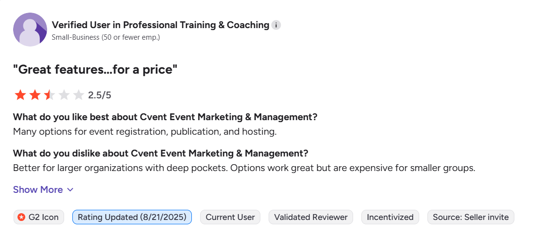 Cvent brings enterprise credibility, but it often asks for patience, technical resources, and a bigger budget to unlock its full potential.