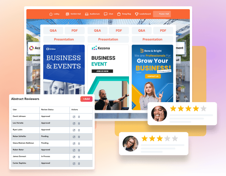 vFairs provides a flexible and user-friendly platform for managing speakers and abstracts across virtual and in-person events. Organizers can create custom submission forms and deadlines, assign reviewers automatically or manually, and run blind or double-blind reviews to keep evaluations fair. Accepted abstracts convert directly into sessions with speaker bios, handouts, and session details. Speakers get a guided profile setup with automatic session linking. A single dashboard lets you track submissions, manage reviews, and export reports. The result is a simple, intuitive workflow that keeps you in control.