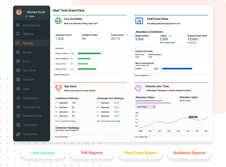 For immediate and detailed reporting needs, like exhibitor ROI, live attendance snapshots, or stakeholder updates, vFairs offers a faster, more intuitive experience that’s well-suited for fast-paced event environments.