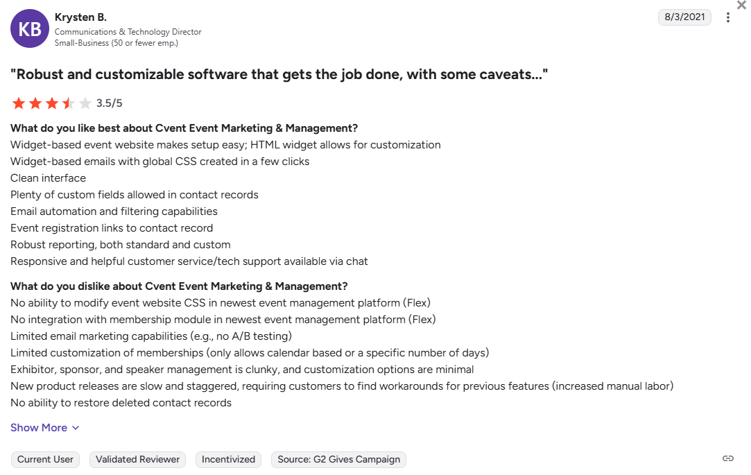 “Exhibitor, sponsor, and speaker management is clunky, and customization options are minimal” – Krysten B., Communication and Technology Director.
